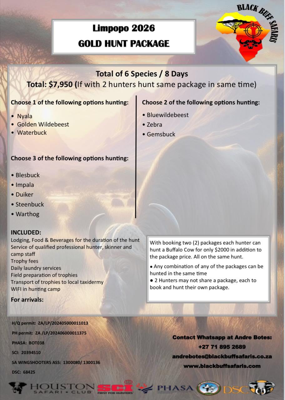 Black Buff Safaris is situated deep in the heart of the warm African bushveld in the Limpopo province of South Africa. Close to the small town of Alldays. With luxurious accommodation and hunting facilities, we cater for both rifle and bow hunting experiences.