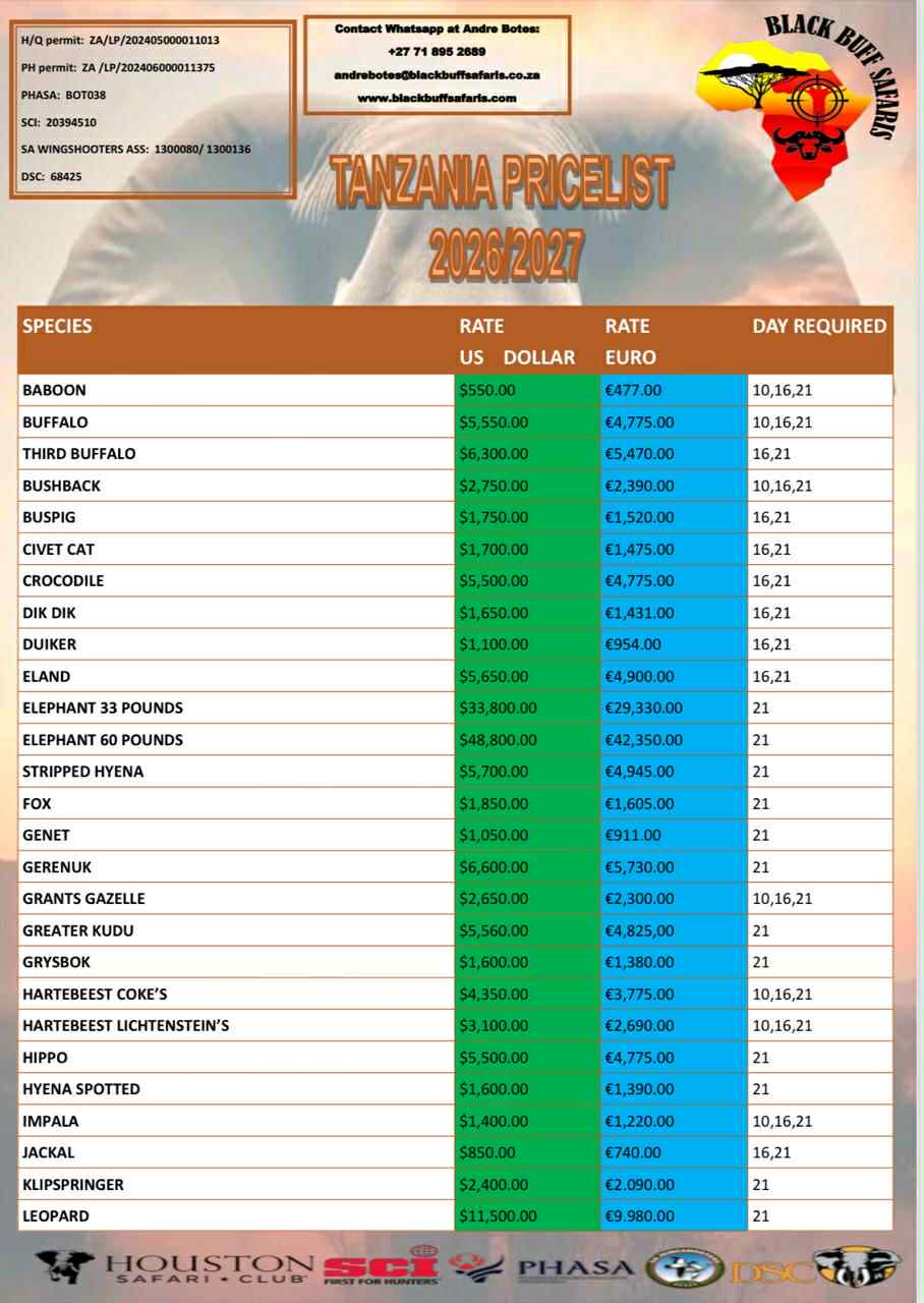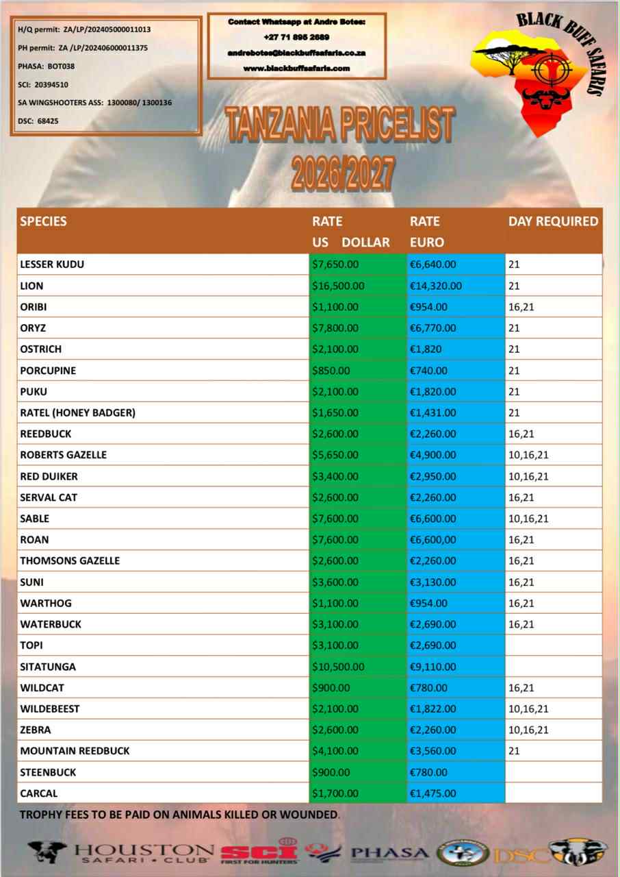 The hunting area covers 4000ha and we have concessions in other hunting areas as well. The climate in the area is very hot in the summer months and can reach temperatures of 42 degrees Celsius. In the winter months, it can be cold during the nights and early mornings with moderate warm temperatures during the day. We offer a wide range of species that can be hunted and more details can be obtained on request.